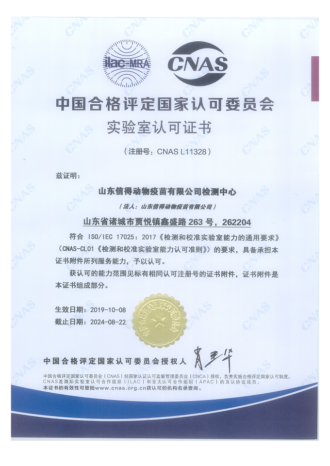 山东888集团动物疫苗有限公司CNAS平台获得国家认证,并通过农业部GCP认证;